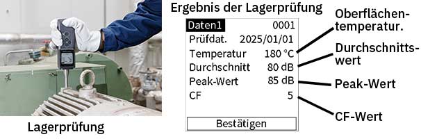 In der Sondenspitze sind sowohl ein Ultraschallsensor als auch ein Temperatursensor eingebaut. Gleichzeitig werden die Schwingungsbeschleunigung und die Oberflächentemperatur gemessen.