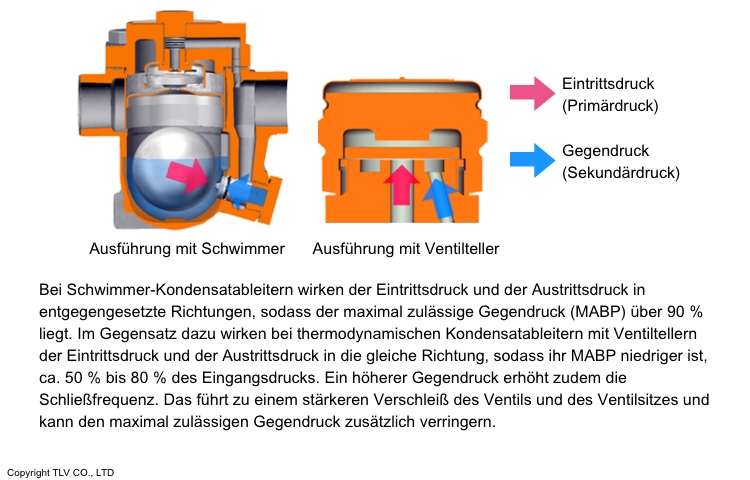 | Wenn das Kondensat in einen Entspannungsbehälter abgeleitet wird und der Druck im Entspannungsbehälter ansteigt, erhöht sich der Gegendruck entsprechend. |