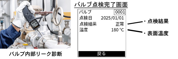 スチームトラップの作動状態や気体配管に取り付けられたバルブの内部漏れの有無を、自動で簡易判定します。閉弁の確認にも有効です。
