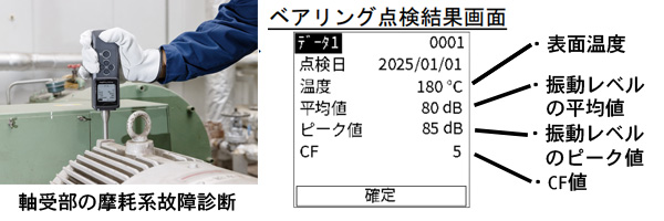 軸受に傷が発生したり、潤滑不良状態に陥ると発生する衝撃波(ショックパルス)を計測する事によって、劣化状況を把握することができます。日々の傾向管理のためのデータ収集にお使いください。