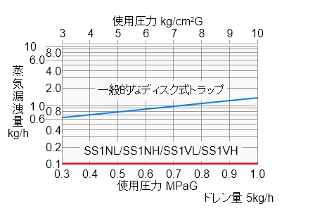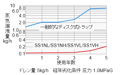 蒸気ロス / 経年劣化の比較(SS1NL/SS1NH/SS1VL/SS1VHと一般的なディスク式トラップ)