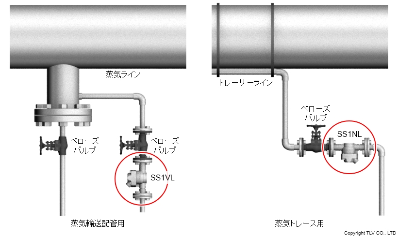 蒸気輸送配管用フリーフロートⓇ・スチームトラップはすべて3点支持機構が組み込まれ、特にドレン量が少ない用途に開発されています。蒸気輸送配管用のみならず、ドレン量の少ない用途の一つであるトレースラインにも有効で、これらのシリーズは別名SST(Super Steam Tracer)シリーズとも名付けられています。一部の装置(高温高圧)用フリーフロートⓇ・スチームトラップ(JHシリーズ)にもSSTのコンセプトが採用され、蒸気輸送配管用に設計されています。