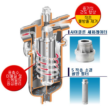 - 내장된 사이클론 세퍼레이터는 (98%의 기수분리율) 응축수, 이물질 및 스케일 등이 필터링 되기 전에 제거합니다.