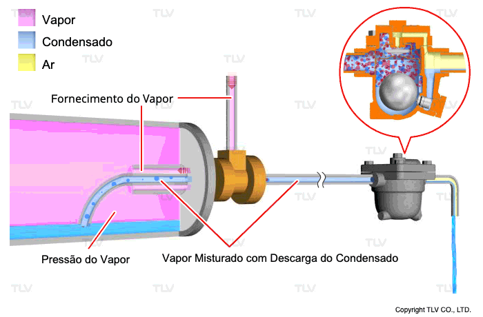 O vapor preso ocorre quando o vapor entra no purgador antes do condensado, forçando a válvula do purgador a permanecer fechada. Isso resulta em acúmulo de condensado, redução da eficiência de transferência de calor e flutuação no desempenho do processo.